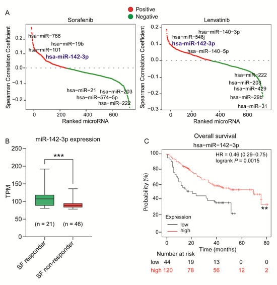 Identification of miR-142-3p as a potential tumor suppressor miRNA in HCC. (A) Waterfall plot depicting the correlation between basal miRNA expression and TKI (sorafenib/lenvatinib) sensitivity in human cancer cell lines (data source: Cancer Cell Encyclopedia and Cancer Therapeutic Response Portal). (B) RNA-sequencing data of transcript per million (TPM) values of miR-142-3p expression in the sorafenib responder vs. non-responder group (BIOSTORM HCC cohort) from GSE109211 in the GEO datasets. Error bars = SD; *** p ≤ 0.001. (C) Kaplan–Meier plot of 166 HCC patients at different stages of the disease to determine the prognostic value of miR-142-3p expression. The p-value was calculated using the log-rank test; ** p = 0.0015. Abbreviations: SF: sorafenib; HR: hazard ratio.