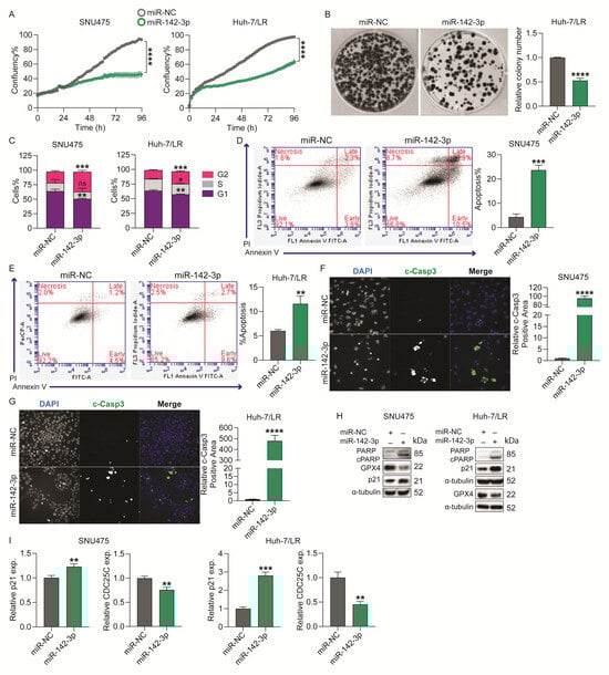 Functional effects of miR-142-3p on proliferation and survival of HCC cells. SNU475 and Huh-7/LR cells were transfected with a 10 nM miR-142-3p mimic or miR-NC and assayed as follows: (A) Incucyte proliferation assay: time-lapse imaging was conducted at 2-h intervals continuously for up to 96 h. (B) Huh-7/LR cell colony formation capacity 14 days post-transfection. (C) Flow cytometric analysis of the cell cycle distribution in HCC cells 72 h post-transfection, following propidium iodide staining. (D,E) The percentage of apoptotic cells was assessed using Annexin V-FITC/propidium iodide staining followed by flow cytometry, with measurements taken 96 h post-transfection for SNU475 cells (D) and 72 h post-transfection for Huh-7/LR cells (E); bar graphs represent the percentage of apoptotic cells. (F,G) Immunofluorescence staining of SNU475 (F) and Huh-7/LR (G) cells with DAPI and cleaved-caspase 3 (c-Casp3) 96 h after transfection. The magnification is 20× and the image analysis was performed using Thermo Fisher Scientific HCS Studio 2.0 Cell Analysis Software on the CellInsight CX7 High Content Analysis System. (H) Western blot analysis of cleaved PARP (cPARP), glutathione peroxidase 4 (GPX4), and p21 protein expression levels 96 h post-transfection. α-tubulin was used as a loading control. (I) RT-qPCR analysis of genes related to cell cycle arrest (p21) and the G2/M transition (CDC25C) after 72 h of transfection. Data were analyzed using the 2−ΔΔCt method with GAPDH as the reference gene and expressed relative to miR-NC. Error bars = SEM (for A) and = SD (for B–I); n = 3. Significance levels are indicated as follows: ns = not significant, * p ≤ 0.05, ** p ≤ 0.01, *** p ≤ 0.001, **** p ≤ 0.0001.