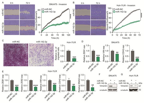 Functional impact of miR-142-3p on HCC cell motility. SNU475 and Huh-7/LR cells were transfected with 10 nM miR-142-3p or miR-NC and assayed as follows: (A,B) Wound healing assays were conducted in the presence of Matrigel to assess the invasion ability of SNU475 (A) and Huh-7/LR. (B). Wound confluence (%) within the scratch area was calculated based on phase-contrast images using the Incucyte ZOOM software, version 2018A (Essen BioScience). Blue lines represent the initial scratch boundaries, and red lines indicate the extent of cell invasion into the scratch area. (C) Transwell chemotaxis assay was used to examine Huh-7/LR cell chemotaxis 48 h after transfection. The images were captured at a magnification of 20× using an Olympus IX-71 Inverted Fluorescence Microscope, with a minimum of four fields per well. (D,E) RT-qPCR analysis of EMT markers in miR-142-3p transfected cells compared to miR-NC control. Data were analyzed using the 2−ΔΔCt method with GAPDH as the reference gene. (F,G) Western blot analysis of vimentin protein expression level after 96 h of transfection. α-tubulin was used as an internal control (housekeeping protein). Error bars = SEM (for A,B) and = SD (for C–E); n = 3. Significance levels are indicated as follows: ** p ≤ 0.01, *** p ≤ 0.001, **** p ≤ 0.0001.