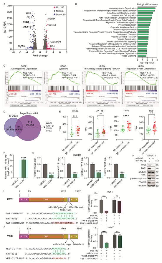 Mechanistic pathway analysis and identification of miR-142-3p targets. (A) Volcano plot of differentially expressed genes between SNU475 cells transfected ± 10nM miR-142-3p mimic or miR-NC control for 24 h, using >2.0-fold change and an FDR of p < 0.05. The 106 transcripts that were identified as significantly upregulated are colored in pink, and the 80 significantly downregulated transcripts are shown in blue. Gray dots indicate no significance (Not sig.) difference between genes expression. (B) Biological processes affected by the 80 downregulated genes using the Enrichr tool. (C) Representative enrichment plots were generated using the GSEA tool to analyze the downregulated genes from the entire RNA-seq data (FDR < 25%, p < 0.01). The green line represents the running enrichment score (ES) for the gene set, and the black vertical bars indicate the positions of the individual genes from the gene set within the ranked list. The bottom gray panel displays the rank order of all differentially expressed genes. (D) Venn diagram of the overlap between the 80 genes downregulated by miR-142-3p in SNU475 cells from the RNA-seq, and 340 predicted target genes for miR-142-3p on TargetScan (v.8.0) with a cumulative weighted context++ score of <−0.25 and at least one seed sequence. (E) TPM values of the expression profiles of miR-142-3p target genes were analyzed in sorafenib responders versus non-responders from the BIOSTORM HCC cohort, using data from GSE109211 in the GEO database. SNU475 cells were transfected with 10 nM miR-142-3p or miR-NC and assayed as follows: (F) miR-142-3p TaqMan microRNA assay with RT-qPCR, showing log2 fold-change normalized to U6 snRNA at 24 h post-transfection. (G) RT-qPCR analysis of the impact of miR-142-3p overexpression on the mRNA expression levels of the four identified target genes at 24 h post-transfection. Data were analyzed using the 2−ΔΔCt method, with GAPDH as the reference gene. (H) Western blot of gene target protein expression at 96 h post-transfection. PRAS40 is encoded by the AKT1S1 gene. α-tubulin was used as an internal control (housekeeping protein). (I,J) Luciferase reporter assay in Huh-7 cells 24 h post-co-transfection with 25 nM miR-142-3p or miR-NC and 500 ng of the reporter plasmids; TWF1 (I) and YES1 (J). A schematic representation of the wild-type (WT) and mutant (MUT) 3′-UTR vectors illustrating miRNA-binding sites is presented. The wild-type binding sites are indicated in green, and the mutated sites are highlighted in red. Luciferase activity is presented as relative to miR-NC. Error bars = SD; n = 3; ns = not significant, ** p < 0.01, *** p < 0.001, and **** p < 0.0001. Abbreviations: GSEA: gene set enrichment analysis; GOBP: gene ontology biological process; KEGG: Kyoto Encyclopedia of Genes and Genomes; NES: normalized enrichment score; NOM-P: nominal p-value; FDR: false discovery rate; TPM: transcripts per million; SF: sorafenib; UTR: untranslated region; CDS: coding sequence.