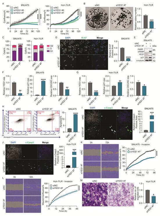 The effect of YES1 knockdown on HCC cell survival and motility. SNU475 or Huh-7/LR cells were transiently transfected with 10 nM YES1 specific siRNAs siYES1 #6 or #7, or a siNC control and assayed as follows. The “#” symbol indicates distinct siRNAs targeting different sequences of the YES1 mRNA transcript, with the numbers referring to individual products supplied by the manufacturer. (A) Incucyte proliferation assay with time-lapse imaging conducted at 2-h intervals continuously for up to 120 h. (B) Effect of YES1 depletion on colony formation capacity of Huh-7/LR cells 14 days post-transfection. (C) Flow cytometric analysis of the cell cycle distribution in SNU475 and Huh-7/LR cells at 72 h post-transfection, following propidium iodide staining. (D) Immunofluorescence analysis of Ki-67 expression 72 h post-transfection of SNU475 cells. The magnification is 20× and the image analysis was performed using Thermo Fisher Scientific HCS Studio 2.0 Cell Analysis Software on the CellInsight CX7 High Content Analysis System. (E) Western blot analysis of cleaved PARP, YES1, and p21 protein expression level after 96 h of transfection of SNU475 cells. α-tubulin was used as an internal control (housekeeping protein). (F,G) RT-qPCR analysis of SNU475 (F) and Huh-7/LR (G) cells to validate YES1 gene knockdown and genes related to cell cycle arrest (p21) and G2/M transition (CDC25C) 72 h post-transfection; data were analyzed using the 2-ΔΔCt method with GAPDH as the reference gene. (H) YES1 downregulation-associated apoptosis was assessed by Annexin V-FITC/propidium iodide staining and flow cytometry 72 h post-transfection. (I,J) Immunofluorescence staining of cleaved caspase 3 (c-Casp3) 72 h post-transfection of SNU475 (I) and Huh-7/LR (J) cells; imagining parameters are as per above (Figure 5D). (K,L) The effect of YES1 knockdown on the invasive ability of SNU475 (K) and Huh-7/LR (L) cells was evaluated using a wound healing assay in the presence of Matrigel; cell invasion was quantified by calculating the percentage of wound confluence within the scratch area based on phase-contrast images analyzed using Incucyte ZOOM software, version 2018A (Essen BioScience); blue lines indicate the initial scratch boundary, and red lines indicate the extent of cell invasion into the scratch area. (M) Transwell chemotaxis assay. The Huh-7/LR cell chemotaxis ability was assessed 48 h post-transfection. The magnification is 20× and images were captured using an Olympus IX-71 Inverted Fluorescence Microscope, with a minimum of four fields per well. Error bars = SEM (A,K,L), or SD (B–J); n = 3. Significance levels are indicated as follows: * p ≤ 0.05, ** p ≤ 0.01, *** p ≤ 0.001, and **** p ≤ 0.0001.