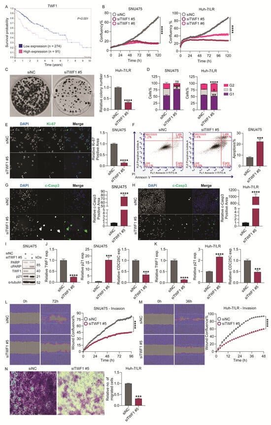 Effects of TWF1 knockdown on HCC cell survival and motility. (A) Kaplan–Meier survival analysis of 365 patients with HCC to determine the prognostic value of TWF1. Patients were categorized into low and high TWF1 expression groups based on data from the Human Protein Atlas (p < 0.001) (https://www.proteinatlas.org/ENSG00000151239-TWF1/pathology/liver+cancer). SNU475 or Huh-7/LR cells were transiently transfected with siRNAs to TWF1 (siTWF1 #5 or #6) or siNC control and assayed as follows. The “#” symbol indicates different siRNAs targeting distinct sequences within the TWF1 mRNA transcript; the numbers correspond to specific product identifiers provided by the supplier. (B) Incucyte proliferation assay using time-lapse imaging at 2-h intervals continuously for up to 120 h. (C) Effect of TWF1 knockdown on colony formation capacity of Huh-7/LR cells 14 days post-transfection. (D) Flow cytometric analysis of the cell cycle distribution in SNU475 and Huh-7/LR cells at 72 h post-transfection, following propidium iodide staining. (E) Immunofluorescence analysis of Ki-67 expression 72 h post-transfection of SNU475 cells. (F) TWF1 downregulation-associated apoptosis was assessed by Annexin V-FITC/propidium iodide staining and flow cytometry 72h after transfection. (G,H) Immunofluorescence staining of cleaved caspase 3 (c-Casp3) 72 h post-transfection in SNU475 (G) and Huh-7/LR (H) cells, to validate apoptosis induction. (I) Western blot analysis of cleaved PARP, TWF1, and p21 expression 96 h post-transfection of SNU475 cells. α-tubulin was used as an internal control (housekeeping protein). (J,K) RT-qPCR analysis of SNU475 (J) and Huh-7/LR (K) cells to validate TWF1 gene knockdown and genes related to cell cycle arrest (p21) and G2/M transition (CDC25C) 72 h after transfection; data were analyzed using the 2−ΔΔCt method with GAPDH as the reference gene. (L,M) The effect of TWF1 knockdown on the invasive ability of SNU475 (L) and Huh-7/LR (M) cells was evaluated using a wound healing assay in the presence of Matrigel; cell invasion was quantified by calculating the percentage of wound confluence within the scratch area based on phase-contrast images analyzed using Incucyte ZOOM software, version 2018A (Essen BioScience). Blue lines indicate initial scratches, and red lines show the boundary of cells that have invaded into the scratch area.Data are presented as mean ± SEM. (N) Transwell chemotaxis assay. Huh-7/LR cell chemotaxis ability was assessed 48 h after transfection. The magnification is 20× and images were captured using an Olympus IX-71 Inverted Fluorescence Microscope, with a minimum of four fields per well. All immunofluorescence was with a 20× magnification, and the image analysis was performed using Thermo Fisher Scientific HCS Studio 2.0 Cell Analysis Software on the CellInsight CX7 High Content Analysis System. Error bars = SD; n = 3. Significance levels are indicated as follows: * p ≤ 0.05, *** p ≤ 0.001, **** p ≤ 0.0001.