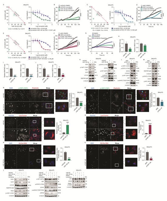 Role of miR-142-3p and its gene targets in modulating TKI sensitivity in HCC cells. (A) SNU475 cells were reverse-transfected with 10 different doses of miR-142-3p mimic or miR-NC in 1/3 serial dilutions (highest dose 100nM), and at 48 h post-transfection were treated with lenvatinib with 10 doses in 1/2 dilution (highest dose 50µM). After 72 h treatment, cell viability was determined using cell titer assay. The combination index (CI) value was determined using the Chou–Talalay method. The IC50 values of lenvatinib alone and in combination with miR-142-3p are shown in graphs. (B) Incucyte proliferation assay of miR-142-3p ± lenvatinib. SNU475 cells were transfected with either 5 nM miR-142-3p or miR-NC, and at 48 h post-transfection were treated with 10 µM lenvatinib or DMSO (vehicle control). Time-lapse imaging was conducted at 2-h intervals continuously for up to 144 h. (C–F) Similar experiments demonstrating the effects of siYES1 or siTWF1 in combination with lenvatinib, as described for miR-142-3p (A,B). The number following the “#” symbol refers to a specific siRNA targeting a defined sequence of the mRNA transcript, as designated by the manufacturer. (G) The Incucyte proliferation assay to assess the growth inhibition efficacy of the combination therapy with dasatinib at IC25 dose (14 µM) and lenvatinib at IC50 dose (12.8 µM) in SNU475 cells. (H–J) RT-qPCR analysis of MAP4K3 and ABCC1 mRNA expression in SNU475 cells transfected with a 10nM miR-142-3p (H), siYES1 #7 (I), or siTWF1 #5 (J) (or relevant negative controls) at 24 h post-transfection; data were analyzed using the 2-ΔΔCt method with GAPDH as the reference gene. (K–M) SNU475 cells were transiently transfected with 10 nM miR-142-3p, siYES1 #7, or siTWF1 #5 or relevant negative controls and western blot analysis performed on lysates at 96 h post-transfection. α-tubulin was used as an internal control (housekeeping protein). (N,O) Immunofluorescence staining of p-YAP1 (Y357) to investigate its nuclear translocation in SNU475 cells transfected with 10nM miR-142-3p (N) or siYES1 #7 (O) for 96 h compared to the controls. (P,Q) Live cell imaging of SNU475 cells transfected with either a 10 nM miR-142-3p mimic (P) or siTWF1 #5 (Q) (or relevant controls) for 96 h, following labeling of lysosomes using 60 nM LysoTracker Deep Red. (R,S) SNU475 cells stained by DQ Red BSA at 96 h post-transfection with either 10 nM miR-142-3p mimic (R), siTWF1 #5 (S), or respective controls to measure lysosomal degradation activity. (T) Pathway analysis in SNU475 cells following combination of miR-142-3p mimic transfection (5nM) and lenvatinib (10 µM) treatment. After 48 h of transfection, the media was replaced with either lenvatinib- or DMSO-containing media and incubated for an additional 48 h. At 96 h post-transfection, cell lysates were collected for analysis. α-tubulin was used as an internal control (housekeeping protein). All immunofluorescence was using 20× magnification and the image analysis was performed using Thermo Fisher Scientific HCS Studio 2.0 Cell Analysis Software on the CellInsight CX7 High Content Analysis System. Error bars = SEM (B,D,F,G) or SD (H–J, N–S); n = 3. Significance levels are indicated as follows: ** p ≤ 0.01, *** p ≤ 0.001, **** p ≤ 0.0001.