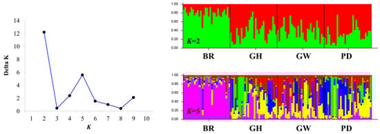 Bayesian clustering analysis maximized the delta population constant (ΔK) value for population structure at K = 2 (Figure 1). The next maximum was the delta K (ΔK) value for the population structure at K = 5 (Figure 1). The STRUCTURE analysis results clearly separated the BR population from the GH, GW, and PD populations (Figure 1). At K = 2, the BR population formed the first group, while the GH, GW, and PD populations constituted the second group. Interestingly, the artificially derived GH and PD populations, originating from the BR population, were genotypically similar to the wild GW population.