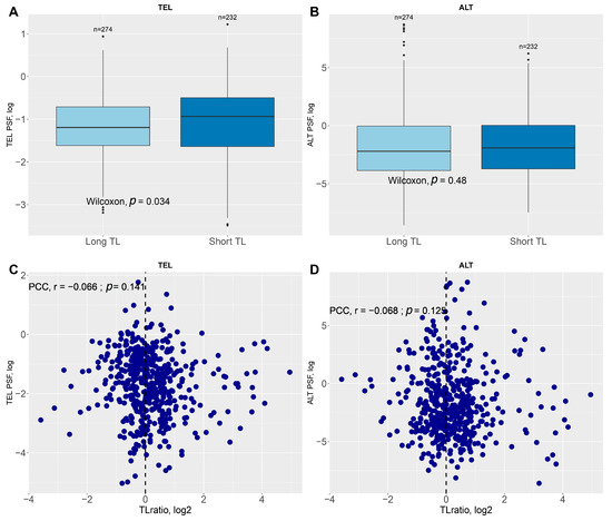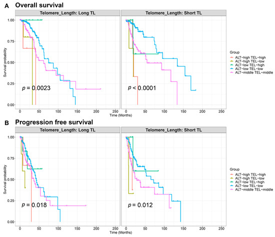 2.3. Survival Analysis Based on Telomere Length and TEL/ALT Pathway Activation