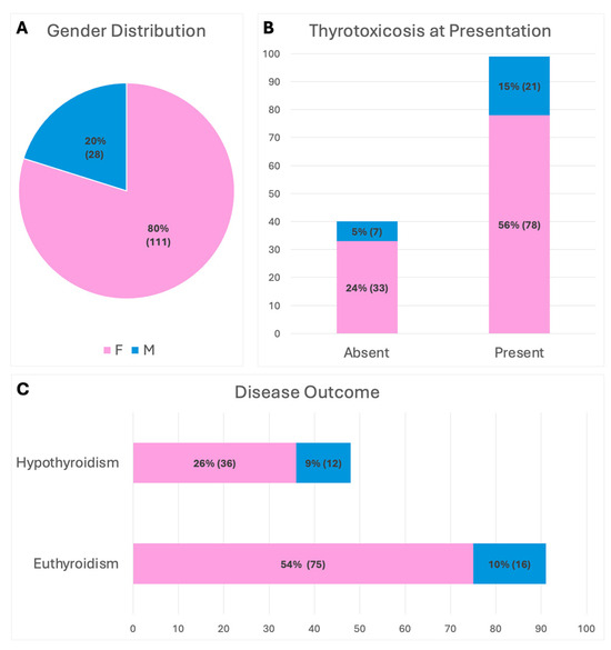 (A) Gender distribution of the cohort. (B) Laboratory evidence of thyrotoxicosis at disease presentation. (C) Disease outcome.