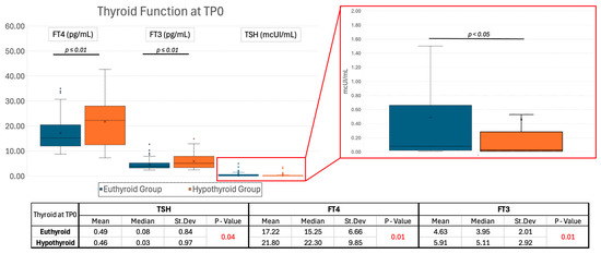 As reported in Figure 2, mean TSH at TP0 between the euthyroid and hypothyroid groups showed a small and marginally significant (p = 0.04) difference. In contrast, the FT4 values at TP0 showed a pronounced and significant (p = 0.01) difference between groups. Additionally, the euthyroid group showed a significantly lower mean FT3 at diagnosis compared to the hypothyroid group (p = 0.01).