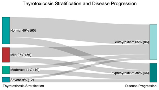 The euthyroid group had a significantly lower thyrotoxicosis severity compared to the hypothyroid one (p = 0.003, Table 1). A euthyroid outcome was observed 51% more frequently in patients with normal FT4 levels than in those who progressed to hypothyroidism (75.38% vs. 24.62%, Table 1, Figure 3). Similarly, mild thyrotoxicosis included 33% more euthyroid patients than hypothyroid patients (66.67% vs. 33.33%). In contrast, moderate thyrotoxicosis was associated with a 15% higher frequency of long-term hypothyroidism (57.89% vs. 42.11%), while severe thyrotoxicosis was linked to a 17% higher frequency of hypothyroidism (58.33% vs. 41.67%).