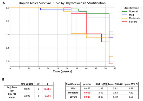 (A) Kaplan-Meier survival curves for hypothyroidism onset stratified by thyrotoxicosis severity at presentation. Patients with severe and moderate thyrotoxicosis experienced an earlier onset of hypothyroidism, whereas those with mild thyrotoxicosis or normal FT4 levels had a delayed progression. (B) The log-rank test confirmed a statistically significant difference in the survival curves. The Cox-PH model resulted significantly. Abbreviations: HR, hazard ratio; CI, confidence interval; PH, proportional hazard; df, degrees of freedom; Exp (B), exponentiated coefficient; HR, hazard ratio.