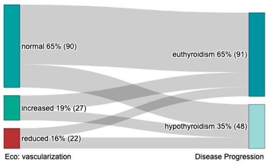 US characteristics at diagnosis are reported in Table 4. Thyroid size and the presence of thyroid nodules or pseudo-nodular areas at diagnosis were unable to predict the course of SAT. At univariate analysis, reduced thyroid vascularization at diagnosis (15% of patients) showed a 28% higher proportion of long-term hypothyroidism (55% vs. 27% respectively, p = 0.036), compared with normal vascularization (64% of patients) (Table 4, Figure 6). Increased vascularization, observed in 19% of patients, was associated with approximately a 14% higher rate of hypothyroidism compared to those with normal vascularization (41% vs. 27%, p = 0.036) (Table 4; Figure 6).