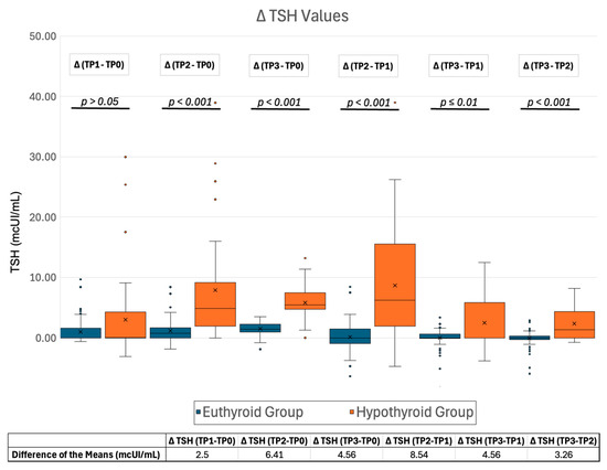 The change in TSH levels (ΔTSH) at different time points was calculated for each patient. ΔTSH values deviated from a normal distribution. Besides ΔTSH (TP1-TP0), all ΔTSHs showed considerable statistical significance in the progressive increment of TSH values between the euthyroid and hypothyroid groups (Figure 7, Supplementary Table S3). In particular, the magnitude of TSH change over time was significantly smaller in patients who were eventually euthyroid at last follow-up (euthyroid group) than those who developed long-term hypothyroidism (hypothyroid group). The most obvious differences in ΔTSHs between the two groups were observed between time points TP2-TP1 and TP2-TP0 (Figure 7).