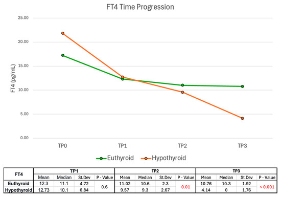 As reported in Figure 8, both groups exhibited a decline in FT4 mean levels during follow-up, but the decrease was faster in the hypothyroid group. Interestingly, at TP1 the FT4 values between the euthyroid and the hypothyroid groups were similar without significant differences, while at TP2 a notable shift occurred (p = 0.01). At TP3, the FT4 mean values between the two groups were similar (10.76 in the euthyroid group and 10.03 in the hypothyroid group). However, many patients in the hypothyroid group were receiving LT4 by this time. Consequently, LT4 values in treated patients were approximated to 0 as a mathematical approximation -acknowledging its limitations and insufficient endogenous hormone production. The Mann-Whitney U tests showed that FT4 values at TP2 and TP3 between the two functional groups were significant in predicting disease outcomes.