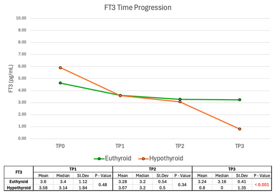 FT3 values show no significant difference between the euthyroid group and the hypothyroid group at TP1 or TP2, while FT3 levels were significantly higher in the euthyroid group at TP3 (p < 0.001) (Figure 9). However, similarly to FT4, the clinical and statistical significance of this finding at TP3 is low due to LT4 replacement therapy in some patients.