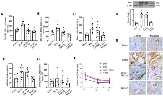 Physiological parameters and renin expression in mice subjected to 2K1C surgery with or without PRO20. Systolic (A) and diastolic (B) blood pressure were increased in 2K1C mice as compared to sham (controls); however, PRO20 was able to prevent this effect. Heart rate showed significant increases in 2K1C mice but not in 2K1C + PRO20 group (C). On day 7, urine collections were used to measure albuminuria and albumin/creatinine ratio. Increased juxtaglomerular renin expression evaluated by cortical tissues and immunoblot showed increased protein levels in 2K1C and 2K1C + PRO20 groups (D). Renin immunostaining was also augmented in both groups (E). There was a slight, but not significant increase in albuminuria in 2K1C and 2K1C + PRO20 mice (F). This trend was not observed when urinary albumin was corrected by urinary creatinine (G). Mice were subjected to a saline load challenge to test the ability of the mice to excrete a saline load. The sodium excretion was significantly lower in 2K1C group at 1 and 3 h post injection as compared with sham (controls). Mice subjected to 2K1C + PRO20 did not show Na+ retention (red line and squares). A saline test was performed on day 6 (H). * p < 0.05 vs. sham (controls). In Figure (E): G: Glomeruli; CD: collecting duct.