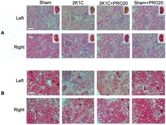 Compared to sham-operated kidneys, clipped kidneys from 2K1C mice did not show changes in kidney size or weight; the color in clipped kidneys was altered as observed in inserts of Figure 2A. When compared to Sham-operated kidneys, left kidneys from 2K1C showed less preserved structures, including loss of glomerular structures. Sham-operated kidneys, left kidneys from 2K1C, showed less preserved structures, including loss of glomerular structures. We also observed the presence of hyaline substances and augmented glomerular size (Figure 2A). Right kidneys in 2K1C and 2K1C + PRO20 groups showed enlarged glomeruli size (2K1C: 50 ± 6; 2K1C + PRO20: 48 ± 8 vs. control [sham]: 43 ± 4 μm, p < 0.05) and capillary to Bowman capsule distance (2K1C: 6 ± 1; 2K1C + PRO20: 7 ± 2 vs. control [sham]: 4 ± 1 μm, p < 0.05). Masson’s trichrome staining showed no evidence of fibrosis in the right kidneys subjected to 2K1C or 2K1C + PRO20 treatments; however, the left kidneys (clipped) showed an increase in blue staining intensity (Figure 2B) that was partially prevented by PRO20 treatment (Percentage of intensity: control [sham]: 12 ± 6%; 2K1C: 63 ± 11%, p < 0.001 vs. control [sham]; 2K1C + PRO20: 45 ± 12%, p < 0.05 vs. control [sham]; PRO20: 15 ± 8%, non-significant vs. control).