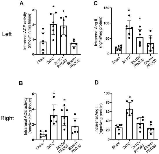 We next tested the ACE activity and intrarenal levels of Ang II as an indicator of the intrarenal RAS function. Intrarenal ACE activity was increased in the left (Figure 3A) and right (Figure 3B) kidneys from 2K1C mice subjected to 7 days of left renal arterial clipping. Infusion of PRO20 in 2K1C mice did not alter this effect. PRO20 alone did not show effects as compared to the controls. Interestingly, intrarenal Ang II was greatly augmented in the left and right kidneys in 2K1C mice; however, PRO20 partially (but not significantly) impaired this effect in the left and right kidneys in 2K1C mice. However, PRO20 partially (but not significantly) impaired this effect in the left kidney. In the right kidneys of 2K1C + PRO20, augmentation of Ang II levels was completely prevented. No effects were observed in the group treated with PRO20 alone.