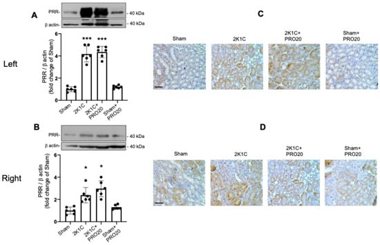 Upregulation of the PRR has been reported in renovascular hypertension in rats []. PRR seems to be functionally relevant in the establishment of hypertension responses as part of intrarenal RAS [,,]. Then, we evaluated protein expression in the clipped and non-clipped kidneys by immunoblot and immunohistochemistry. Protein levels of the PRR were augmented in left kidneys (fold change in control sham: 4.1 ± 0.2 vs. 1.0 ± 0.1, p < 0.001) and around two-fold in right kidneys (fold change in control [sham]: 2.3 ± 0.2 vs. 1.0 ± 0.1, p < 0.05). PRO20 did not have any effect on PRR increases in the left or right kidneys (Figure 4A,B). Immunostaining showed an increase in the intensity of brown-labeling in kidney tubules (mostly proximal and collecting ducts, as judged by tubular structures) in 2K1C and 2K1C + PRO20 groups (Figure 4C). Similarly, immunostaining in the right kidneys showed increased labeling in the 2K1C and 2K1C + PRO20 groups. No changes were observed in the PRO20 group.