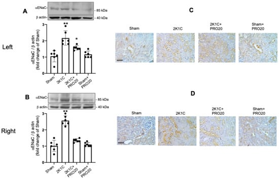 2K1C surgery increases αENaC expression in clipped and non-clipped kidneys, while PRO20 prevents this effect. Since PRO20 was able to prevent intrarenal Ang II levels in both kidneys, and because Ang II may be able to regulate ENaC abundance, we evaluated the expression of αENaC subunit. The 2K1C surgery increased αENaC expression in the clipped kidney that was partially prevented by PRO20 (A). In contrast, PRO20 systemic infusions in 2K1C mice completely blunted αENaC subunit upregulation after 7 days (B). Immunostaining analysis in the left (C) and right (D) kidneys confirmed the evidence demonstrated by immunoblot. ** p < 0.01, * p < 0.05 versus the sham (control) group. Scale bar in (C,D): 50 μm.