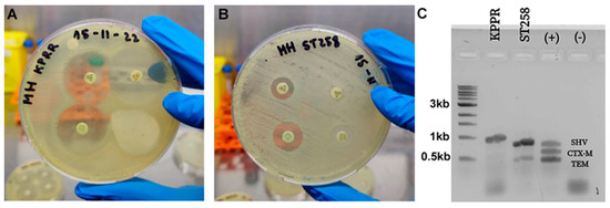 The bacterial susceptibility was assayed in vitro by the Kirby–Bauer methodology using a diffusion disc in a Petri dish for the ESBL characterization of the KPPR-1 and ST258 K. pneumoniae strains. The strains grown in LB broth were suspended in ca-MH broth at an OD600 of 0.08–0.13 nm, equivalent to 0.5 MacFarland. Lawn seeding on MH Agar was used to place the antibiotic discs and incubated at 37 °C for 16–20 h, following CLSI guidelines [46]. Figure 2 confirms that the KPPR-1 strain is susceptible to ceftazidime (Caz), Caz + clavulanic acid (Cla), Ceftriaxone (Cro) and Cro + Cla by showing an inhibition halo > 5 mm (Figure 2A). On the other hand, it is confirmed that strain ST258 is not susceptible to Caz or Cro since it does not present an inhibition halo but shows sensitivity to Caz + Cla and Cro + Cla when presenting a halo > 5 mm (Figure 2B). The susceptibility profile of strain ST258 confirmed it phenotypically as ESBL according to the standard CLSI protocol. The non-ESBL and ESBL status were subsequently confirmed genotypically by the multiplex PCR assay, which identified the associated carrier genes [47]. Figure 2C shows that strain KPPR-1 harbors only the SHV gene, whereas strain ST258 harbors both the SHV and TEM genes.