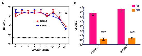 The CuC1 activity reduces bacterial viability by 3 log10, the minimum required to classify it as a photosensitizer [46]. Activity that, although not optimal for treatment, does not increase significantly with an increase in PS concentration. Other authors have improved the photodynamic activity of PS by mixing them with several compounds, such as nanoparticles [48]. We first mixed 1 × 107 CFU/mL of K. pneumoniae strains with concentrations of ZnONP in the 0 to 128 μg/mL range in PBS 1x and subjected it for 10 min to 61.2 J/cm2 fluency. As shown in Figure 4A, although a significant decrease in bacterial viability occurred, even at the highest concentrations of the nanoparticles, it did not reach 3 log10 reduction. Then, we chose to start with 80 μg/mL nanoparticles to be mixed with the CuC1 PS following the research done by the group of Garin et al., 2021 [22]. An initial mixture of 4 µg/mL of the CuC1 compound and 80 µg/mL of zinc oxide nanoparticles were combined with 1 × 107 CFU/mL of K. pneumoniae strains KPPR-1 and ST258. As indicated above, a PDT group was subjected for 10 min to 61.2 J/cm2 fluency, and a PS group was kept in the dark for the same period. Figure 4B shows that the ZnONP significantly increased (p < 0.001) the bactericidal capacity of the CuC1 photosensitizer, reducing the viability of the KPPR-1 and the ST258 strains >5 log10 compared to the untreated controls. We then determined at what concentration the zinc nanoparticle shows bactericidal photodynamic activity.