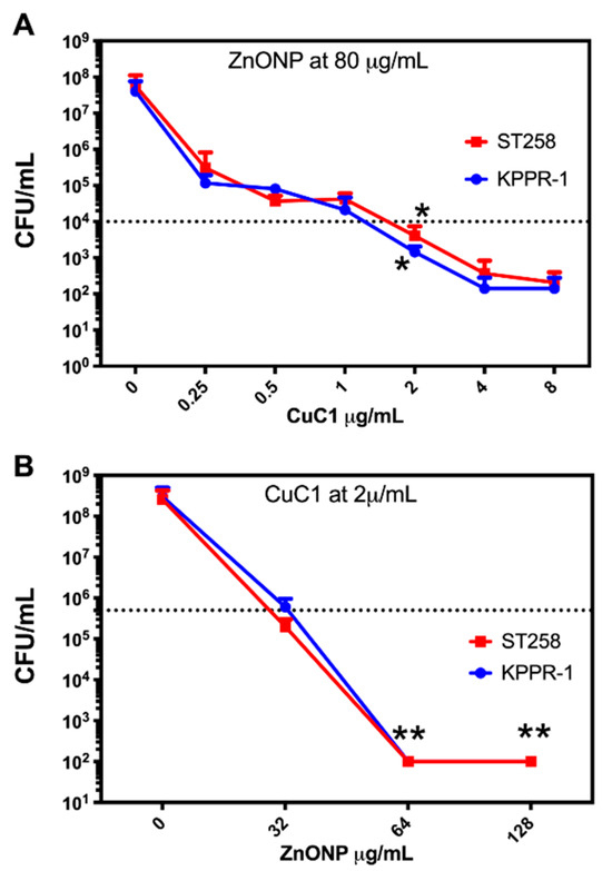 Determination of the minimum inhibitory concentration of CuCl + ZnONP mix. The minimal effective concentration of serial dilutions of CuCl photosensitizer mixed with a fixed concentration of 80 µg/mL of ZnONP was determined in K. pneumoniae KPPR-1 and ST258 strains (A). The minimal effective concentration of serial dilutions of 0–128 µg/mL of ZnONP photosensitizer mixed with a fixed concentration of 2 µg/mL of CuCl was determined in K. pneumoniae KPPR-1 and ST258 strains (B). Bacterial viability was assessed after PDT exposure and expressed as log10 of mean ± SD * = p < 0.05; ** = p < 0.01 ANOVA test compared to untreated control.