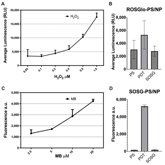 Detection of reactive oxygen species produced by PS/NP mix. Luminescence (RLU) of the H2O2 (A) and the fluorescence of the MB (C), standard curves. Luminescence (B) and fluorescence (D) of the 1:32 PS/NP mix at 2 μg/mL CuC1 activated (PDT) or without light activation (PS) and probe solely without PS/NP mix (ROS-Glo or SOSG, respectively).