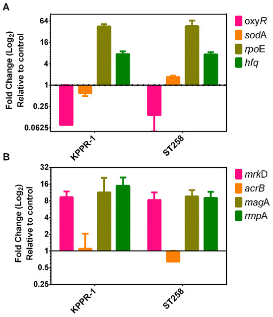 Our results suggest that the type II mechanism predominates over the type I mechanism, characterized by a strong overexpression of the regulatory factor RpoE. In K. pneumoniae, the RpoE transcriptional factor controls the expression of extracytoplasmic factors such as the MrkD, MagA, RmpA and AcrB proteins [12,33]. As shown in Figure 7B, in the KPPR-1 and ST258 strains, PDT significantly (p < 0.05) overexpressed (mean of 8- to 15-fold) the bacterial cell envelope maintenance mrkD, magA and rmpA genes. However, the efflux pump gene acrB showed mixed results between the two strains studied, with no significant overexpression (mean 1.1 ± 2SD-fold) in the KPPR-1 strain and a significant (p < 0.05) downregulation (0.64-fold) in the ST258 strain. The overexpression of these factors suggests that damage occurs in the cell envelope structures that the bacteria attempt to replace.