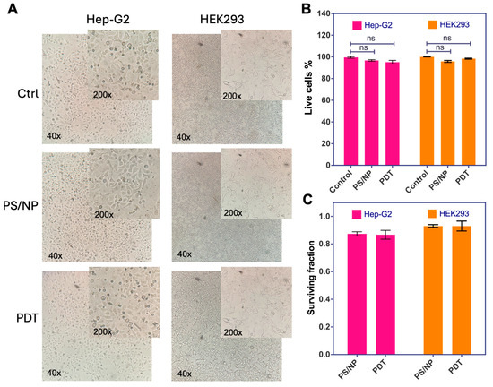 To evaluate cell death, the DMEM + 10% FBS medium was replenished after treatment and the cells were incubated for an additional 24 h at 37 °C with 5% CO2. As shown in Figure 8A, no signs of cytotoxicity were observed in the treated Hep-G2 or HEK293 cells compared to control cells. Additionally, no dark cytotoxicity was noted in cells treated with the PS/NP mix but not exposed to light. To quantify cytotoxicity, the cells were trypsinized, combined with trypan blue and the dead cells were counted in a hemocytometer chamber. As shown in Figure 8B, when Hep-G2 or HEK293 cell lines were exposed to the PS/NP mix in the dark or activated by light, the number of live cells was not significantly reduced (ns = p > 0.05, Student’s t-test comparing treated cells with the controls of the untreated cells). A colony-forming assay was conducted to determine cell viability [52]. Following treatment, cells were trypsinized and an aliquot containing 1000 Hep-G2 or 500 KEK293 cells was seeded into a 6-well plate containing DMEM + 10% FBS medium and incubated for five to seven days at 37 °C with 5% CO2. Once colonies formed, the medium was removed and the cells were fixed with methanol and stained with crystal violet. Colonies consisting of 50 or more cells were recorded, and cell viability was calculated as colonies formed over seeded cells, comparing treated with untreated cells. As shown in Table 3, the plating efficiency (PE) was determined to be 17% and 22.3% for Hep-G2 and HEK293 of the control cells, respectively. Table 3 and Figure 8C present cell viability expressed as the surviving fraction (SF: mean ± SD) of treated cells. There was no significant reduction in the number of viable cells for liver Hep-G2 or kidney HEK2-93 cell lines exposed to the PS/NP mixture, whether in the dark or activated by light.