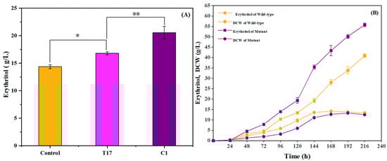 Erythritol production and dry cell weight (DCW) of the mutant strains compared to those of the wild-type. (A) Comparison of erythritol production capacity between mutant strains and the wild-type strain of Y. lipolytica. Note: data are presented as mean ± SD (n = 3). Statistical significance was determined by Student’s t-test (* p < 0.05; ** p < 0.01). (B) Time-course of erythritol production and DCW of both the wild-type strain and mutant C1. Yellow squares: Erythritol production (g/L) of the wild-type strain; Yellow circles: DCW (g/L) of the wild-type strain; purple squares: Erythritol production (g/L) of the mutant C1; purple circles: DCW (g/L) of the mutant C1.