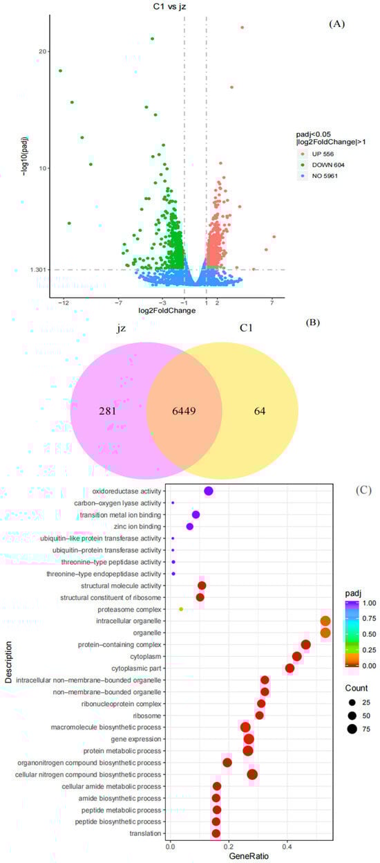Comparative transcriptome analysis by RNA-seq reveals differential gene expression between mutant C1 and its wild-type strain in Y. lipolytica. (A) Volcano plot of differentially expressed genes (DEGs), in which red dots depict up-regulated DEGs, green dots depict down-regulated DEGs, and blue dots represent non-significant genes. The X-axis depicts the multiple of difference after log2 transformation, and the Y-axis depicts the significance value after −log10 transformation. (B) Venn diagram analysis identifying 6449 shared genes between the wild-type and mutant, with 64 genes unique to the mutant and 281 genes exclusive to the wild-type. (C) Enrichment map of the top 30 Gene Ontology (GO) terms ranked by the lowest padj, categorized into three domains: biological process (BP), molecular function (MF), and cellular component (CC). The bubble size corresponds to the number of DEGs per term, the X-axis is the enrichment ratio, and the Y-axis is the GO term, the significance of gene set enrichment is visualized through a color gradient (deeper red indicates lower adjusted p-values, padj) (D) KEGG pathway enrichment analysis of DEGs identifying the top 40 significantly enriched pathways, categorized into four functional classes according to KEGG Brite Hierarchy: metabolism, Genetic Information Processing, Cellular Processes, and Organismal Systems.