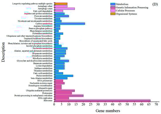 To understand why the mutated Y. lipolytica shows augmented productivity and to identify the factor accountable for this enhancement, comparative transcriptome sequencing of both wild-type strain CICC 33063 and mutant C1 was performed by the RNA-seq assay on the Illumina Nova Seq 6000 platform (Novogene Co., Ltd., Beijing, China) The raw data garnered from the RNA-seq assay were subsequently submitted to the NCBI SRA database (ID: PRJNA975267), and a comparison of the mRNA expression level between the two strains was implemented, grounded on the transcriptome analysis. As presented in Figure 2A, the volcano plot revealed that a total of 1160 genes were differentially expressed in the mutant, among which 604 genes were down-regulated and 556 genes were up-regulated. The Venn diagram in Figure 2B shows the differentially expressed genes (DEGs) between the two strains, in which there are 6449 shared genes along with 281 genes exclusive to the wild-type strain and 64 genes specific to the mutant. These data reveal significant differences in the gene expression levels of the mutant compared to its parent strain (p < 0.05). Subsequently, Gene Ontology (GO) and Kyoto Encyclopedia of Genes and Genomes (KEGG) analyses were executed for a comprehensive functional enrichment assessment to further illuminate those DEGs. In the GO analysis, pronounced discrepancies were detected in the DEGs related to cellular components (CCs), biological processes (BPs), and molecular functions (MFs). As shown in Figure 2C, specific modifications were observed in cell membrane structures and organelles, including both non-membrane-bound organelles and outer membranes. Prior studies have illustrated that mutagenic factors can induce mutations in genes encoding membrane-associated proteins, thereby altering the functionality of membrane structures and organelles, ultimately leading to adaptive responses to mutagenic stimuli []. The enriched differentially expressed genes (DEGs) were further analyzed through KEGG pathway annotation. Based on the KEGG classification system, the top 40 enriched DEGs were categorized into four functional modules: metabolism, Genetic Information Processing, Cellular Processes, and Organismal Systems. The KEGG pathway enrichment analysis demonstrated that the highest number of DEGs were enriched in the ribosome, which is closely associated with protein translation.