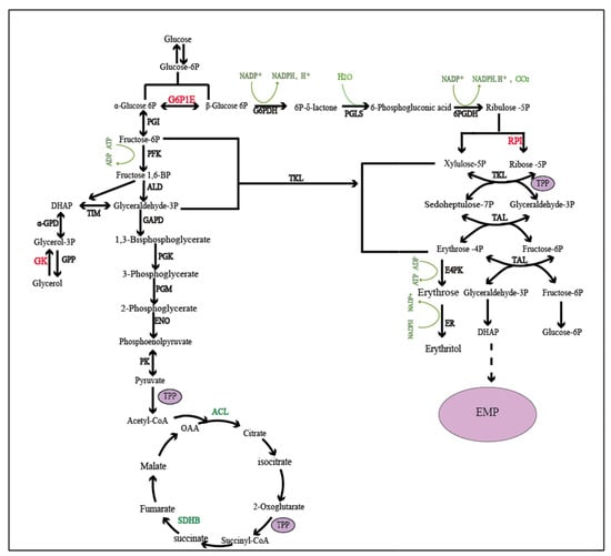 Central carbon metabolism comprises the Embden–Meyerhof–Parnas (EMP) pathway, the tricarboxylic acid (TCA) cycle, and the pentose phosphate pathway (PPP), which provide biochemical precursors and the energy supply for cells []. As shown in Figure 3, erythritol was synthesized in the PPP, including both oxidative and non-oxidative synthesis []. Comparative transcriptome analysis also suggested that the significant difference at the gene expression level occurred in those metabolic pathways. As shown in the TCA cycle (Figure 3), the succinate dehydrogenase (ubiquinone) iron-sulfur subunit (SDHB) is responsible for catalyzing the conversion of succinic acid to fumaric acid [], and ATP-citrate lyase (ACLY) is responsible for catalyzing the conversion of citric acid to acetyl-CoA []. The expression level of those two genes in mutant C1 was significantly down-regulated to 0.28-fold and 0.4-fold of the control, respectively, which resulted in an inhibition of the oxidation of pyruvate entering the TCA cycle and suppressing the normal working of the EMP-TCA metabolic pathway. Considering the competitive carbon flux of glucose in the central metabolic pathway [], such down-regulation of these genes likely shifted carbon flux away from the TCA cycle, redirecting it to alternative glucose metabolism pathways. This led to sufficient carbon flux availability, which supported erythritol production. Thus, these two down-regulated genes in the TCA cycle were selected as the key genes affecting erythritol production.