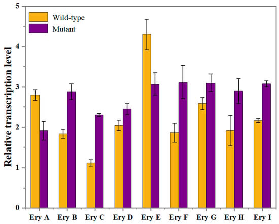 Validation for the expression level of key genes affecting erythritol production in Y. lipolytica by RT-qPCR. The genes encode succinate dehydrogenase (ubiquinone) iron-sulfur subunit (EryA), glucose-6-phosphate-1-epimerase (EryB), ribose-5-phosphate isomerase (EryC), glycerol kinase (EryD), ATP citrate-lyase (EryE), adenylate kinase (EryF), acyl-CoA oxidase (EryG), alcohol dehydrogenase (EryH), and enoyl-CoA hydratase (EryI).