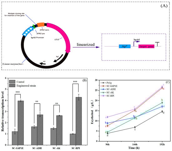 Improvement in erythritol production by rational metabolic engineering. (A) Construction of recombinant plasmids. (B) Relative transcript levels of the target gene in the engineered strain. Note: Data are presented as mean ± SD (n = 3). Statistical significance was determined by Student’s t-test (** p < 0.01; *** p < 0.001). (C) Time-course of the engineered strains for erythritol production, in which erythritol production was determined in the engineered strains containing genes encoding RPI, G6P1E, AK, and ADH. Note: Values labeled with different lowercase letters (a, b, c, d) indicate significant differences (p < 0.05, one-way ANOVA, biological replicates n = 3).