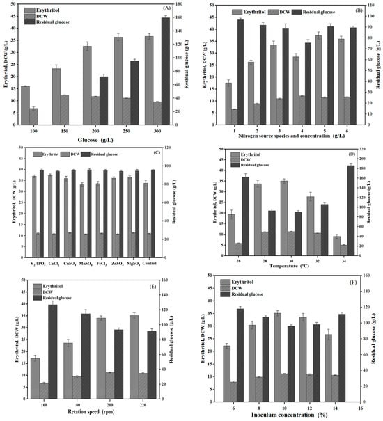 Effect of glucose content (A), yeast extract content or combined yeast extract with urea, where 1: 8 g yeast extract, 2: 10 g yeast extract, 3: 12 g yeast extract, 4: 15 g yeast extract, 5: 10 g yeast extract and 1 g urea, and 6: 10 g yeast extract and 1.5 g urea (B), metal ions (C), culture temperature (D), rotation speed (E), and inoculum concentration (F) on erythritol production by Y. lipolytica mutant C1.