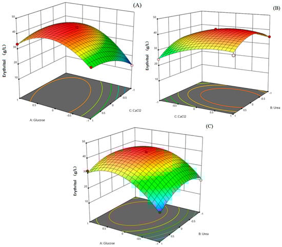 The combined effects of all factors on erythritol production analyzed by the response surface methodology. (A) The combined effect of glucose with CaCl2 on erythritol yield. (B) The combined effect of urea with CaCl2 on erythritol yield. (C) The combined effect of urea with glucose on erythritol yield. The color gradient in the three-dimensional response surface plot represents the magnitude of the response variable (erythritol production, g/L). As shown in the color bar, blue correspond to lower values, while red indicate higher values.