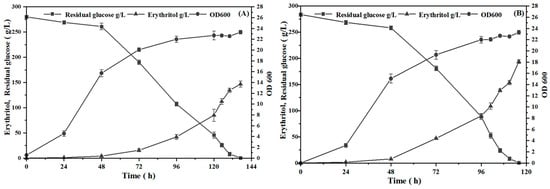 To evaluate the potential of erythritol production by Y. lipolytica mutant C1, batch fermentation was carried out in a 10 L fermenter with 7 L of the culture medium. Variable ventilation quality and stirring speed were used in the process of fermentation at 30 °C without adjusting the culture pH. As shown in Figure 8, a low ventilation quality and stirring speed resulted in rapid cell growth but a low erythritol production during the first 48 h of incubation. Such low erythritol production might be due to much more carbon flux being directed toward cell growth rather than erythritol synthesis in the beginning stage of fermentation. Subsequently, the accumulation of sugar alcohol becomes faster due to the increase in ventilation volume and stirring speed. As shown in Figure 8A, the erythritol content in the culture fluid was 149.33 g/L, and the productivity was 1.09 g/L/h after the wild-type strain was incubated for 137 h. In contrast, the erythritol content in the culture fluid was up to 194.47 g/L and the erythritol productivity was 1.68 g/L/h when mutant C1 was incubated for 116 h (Figure 8B). In comparison with the wild-type strain, the erythritol yield by Y. lipolytica mutant C1 was increased by 30%, and the fermentation time was shortened by 21 h.