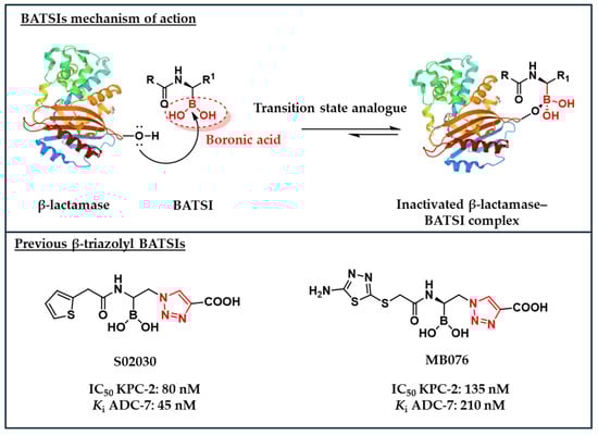 Both S02030 and MB076 feature a 1,4-disubstituted 1,2,3-triazole moiety, synthesised via copper-catalysed azide–alkyne cycloaddition (CuAAC) [17]. The triazole’s affinity for the β-lactamases active site, combined with the broad availability of azides and alkynes, opens up opportunities for creating novel BATSIs [37,38].
