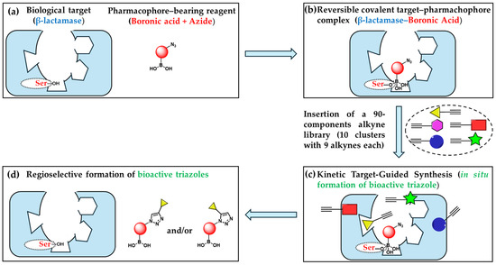 In this context, an attractive approach to obtain triazole-decorated molecules is represented by kinetic target-guided synthesis (KTGS), an appealing drug discovery method where the target protein catalyses the synthesis of its own inhibitors [39]. In KTGS, the protein-templated synthesis of bioactive compounds is achieved once the target facilitates the approaching of affine reagents with proper orientation, therefore lowering the energy of activation required for their irreversible binding [39]. KTGS allows for efficient screening of small molecules, particularly through in situ click chemistry, where the target enzyme guides the formation of disubstituted 1,2,3-triazoles from azides and alkynes [40,41,42,43,44,45,46,47,48]. In situ click chemistry efficiency is driven by the ability of the target enzyme to overcome the high energy of activation required for (3 + 2) cycloaddition reactions (>25–30 kcal/mol) [49,50,51]. Successful examples of this technique are mostly focused on the generation of non-covalent compounds, starting from previously reported inhibitors in a binary format (pairs of reagents) [39]. Although KTGS has been known for more than two decades, reports on its application remain relatively infrequent, with only a few unsuccessful examples being documented in the literature [39,52,53]. This limited adoption is probably due to the lack of robust and generalisable protocols. The difficulty in the detection of false negatives have also contributed to the slow progress of KTGS in drug discovery pipelines [50,54,55]. With fewer than 10% of KTGS studies focusing on covalent inhibitors, examples of this approach have not yet been reported for developing BATSIs or BLIs [39,46]. This highlights an untapped potential in using KTGS for covalent drug discovery, specifically in the design of novel inhibitors targeting β-lactamases.