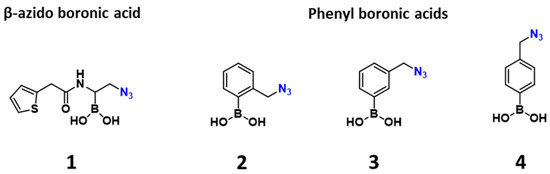 KTGS allows for the development of potent inhibitors without prior knowledge of their target affinities, provided that one of the two components demonstrates sufficient affinity to act as an anchor molecule [50]. Previously, even a low level of affinity was reported to be sufficient for the target-templated reaction [50]. Therefore, to enable in situ click chemistry within the β-lactamase’s binding pocket, a series of bifunctional “warheads” displaying two defined features were designed. Firstly, the presence of the boronic acid moiety serves as an anchor to the SBLs catalytic serine. Secondly, the azido functionalisation guarantees the clickable building block for generation of bioactive triazoles within the target active site. Thus, one 2-azido-1-acylamino-ethaneboronic acid and three azidomethyl-phenylboronic acids were synthesised and characterised (Figure 3). Inspired by one of the most potent BATSI, S02030 (Figure 2), [17,19,36] compound 1 was obtained through deprotection of the corresponding pinanediol ester, following a previously reported procedure [17]. Herein, the amide side chain from cephalothin is well known to interact with various β-lactamases through van der Waals and H-bonding interactions and can aid the process of recognition within the target [56]. Although being a promising scaffold for potential novel inhibitors, we observed by 1H NMR studies that compound 1 partially degrades in phosphate buffer (see Supplementary Information, Figures S1 and S2); therefore, this warhead was excluded from further studies. Other warheads inspired by previously developed acyclic boronic acids were not considered in this manuscript and will be explored in future works [20,33,34,35].