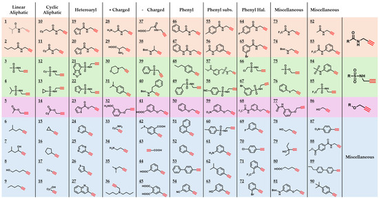 The 90-component alkyne library. Alkynes are separated into 10 clusters (columns) by their chemical and steric properties. Each cluster contains 9 alkynes, generally including an amido group (orange rows), sulphonamides (green rows), and ester or ether (magenta rows) scaffolds.
