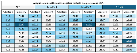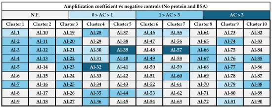 Cluster of alkynes preparation. Mixtures of alkynes (cluster 1 to 10, see Figure 4) were prepared from a dimethylsulphoxide (DMSO) 50 mM stock solution of each alkyne; mixtures X (10 clusters of 9 alkynes): mixing 10 µL of DMSO to 10 µL of stock solutions of 9 alkynes to reach a 5 mM final concentration of each alkyne.