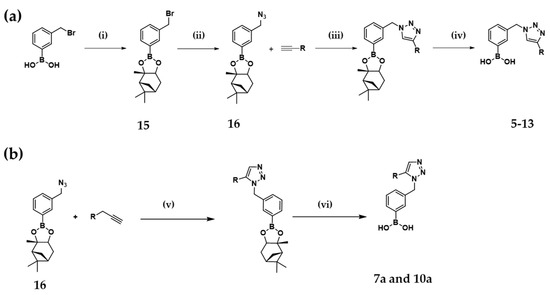 (a) General synthesis for 1,4-derivatives BATSIs. Reagents and conditions: (i) m-bromomethylphenyl boronic acid (1.0 eq.), (+)-pinanediol (1.0 eq.), THF, rt, on, quantitative. (ii) Compound 15 (1.0 eq.), NaN3 (10.0 eq.), MeOH, reflux, 5 h, 82%. (iii) Compound 16 (1.0 eq.), alkyne (1.0 eq.), CuSO4 (0.05 eq.), Na ascorbate (0.2 eq.), THPTA (0.05 eq.), t-BuOH:H2O 1:1, 60 °C, 1–8 h, 80–99%. (iv) Protected triazoles (1.0 eq.), MeB(OH)2 (10.0 eq.), HCl 0.2 M (1.0 eq.), DCM, rt, on, 50–99%. (b) General synthesis for 1,5-derivatives BATSIs starting from compound 16. (v) Compound 16 (1.0 eq.), alkyne (1.1 eq.), Cp*RuCl(PPh3)2 (0.025 eq.), THF, 70 °C, 8 h, 38–41%. (vi) Protected triazoles (1.0 eq.), MeB(OH)2 (10.0 eq.), HCl 0.2 M (1 eq.), DCM, rt, on, 45–50%.
