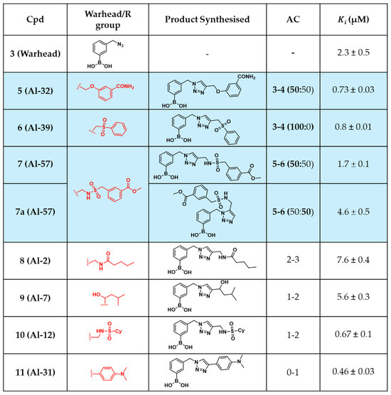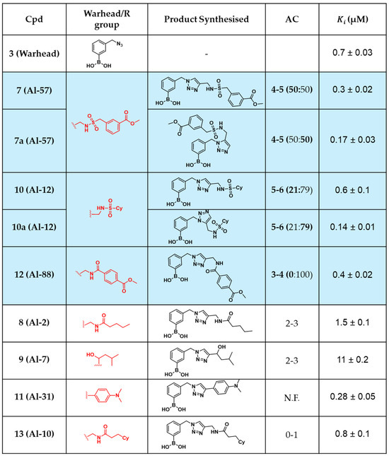 Microbiological assays with AmpC highlighted the 1,5-regioisomer 10a (Figure 9, AC 5-6) as the most potent inhibitor, showing a Ki value of 140 nM. The corresponding 1,4-regioisomer 10, observed at 21% in the screening, displayed nanomolar potency (Ki = 600 nM), yet it was four-fold weaker with respect to the 1,5-regioisomer. Compounds 7 and 12, identified with ACs of 4-5 and 3-4, respectively, were also effective inhibitors (Ki = 300 and 400 nM, respectively). The relative 1,5-regioisomer 7a exhibited an excellent inhibitory activity with Ki of 170 nM. Notably, warhead 3 itself exhibited a Ki of 700 nM. Control compounds (cpds 8, 9, 11, and 13) displayed a various range of activity. While controls 8 and 9 exhibited worse inhibitory activity (Ki = 1.5 and 11 µM, respectively) when compared with warhead 3, cpds 11 and 13 demonstrated similar activity (Ki = 280 and 800 nM, respectively) to the triazoles selected from the AmpC screening.