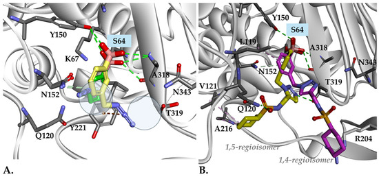 To gain a better understanding of the mechanism of the AmpC-catalysed in situ click chemistry, molecular docking simulations were implemented. LibDock score was used as a relative metric for comparing ligand poses (warhead 3 and compounds 10 and 10a) derived from the AmpC screening, prioritising complementarity and stability in the binding site (e.g., VDW vs. electrostatic) [65,66]. In this regard, the higher the score, the higher the probability of a compound with a high binding affinity. Based on this scoring, for AmpC, the conformations of warhead 3 have the lowest score (less than 80). 1,5-regioisomers 10a have the highest score (120–123), followed by its relative 1,4-regioisomers 10 (112–115). Binding free energy was also estimated between each ligand and enzyme. Using CHARMm-based energies and implicit solvation methods, the overall binding free energy was determined from ligand energy, protein energy, and entropic energy [67]. The interaction energy protocol was used to calculate the non-bound interactions (i.e., van de Waals, electrostatic) between each compound and active site residues. As expected, warhead 3 had the worst interaction energy (−12.23 kcal/mol), while the best compound 10a had the highest (−21.3 kcal/mol), therefore supporting the data obtained from the AmpC screening. Furthermore, the molecular docking of warhead 3 into the active site of E. coli AmpC revealed that hydroxy boronate maintains the tetrahedral conformation observed in prior X-ray structures, forming hydrogen bonds with conserved catalytic residues Y150 and A318 (Figure 11A). Moreover, the phenyl ring engages in π–π interactions with N152 or Y221. Warhead 3 allows for two different conformations with comparable interaction energies (~12.23 kcal/mol). The alkyne fragments may preferentially bind with any of the conformations (left or right), and the new formed triazole will bind with residues T319, N343, or Q120. The docking of the 1,4-regioisomer 10 and the 1,5-regioisomer 10a into the active site of AmpC shows two distinct binding patterns (Figure 11B). The shared phenylboronate core maintains steric interactions with N152. The 1,5-regioisomer 10a, which has the highest binding affinity (140 nM) and the most favourable interaction energy (−21.43 kcal/mol), forms interactions between its triazole and T319 and between SO2 and Q120. Its cyclohexane group engages in steric interactions with A216 and V121. In contrast, the 1,4-regioisomer 10a has a less favourable interaction energy (−13.38 kcal/mol) and positions its cyclohexane group toward R204.