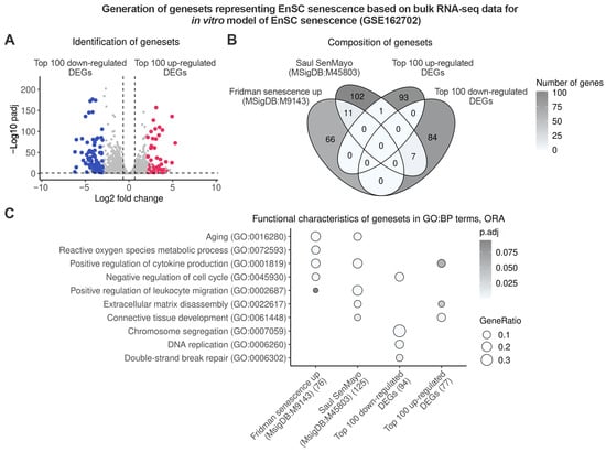 Identification of genesets to detect stromal senescence in proliferative endometrium. Bulk RNA-seq data GSE162702 were utilized to estimate DEGs between senescent and normal proliferating EnSC in vitro. (A) Volcano plot displaying selected DEGs. (B) Venn diagram illustrating the intersections of identified genesets with classic senescence genesets of ‘Fridman senescence up’ and ‘Saul SenMayo’. (C) Evaluation of biological processes mediated by the analyzed genesets.