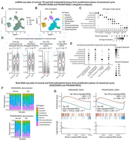 The endometrium of patients with IUA is characterized by an increased level of stromal senescence during the proliferative phase compared to healthy donors. The expression of classic and EnSC-specific senescence gene signatures was assessed in endometrial tissue at the single-cell and bulk tissue sample levels. Normal—healthy donors, TE—patients with thin endometrium, IUA—patients with intrauterine adhesions. Single-cell analysis was conducted by integrating two scRNA-seq datasets, PRJNA730360 (Normal n = 3, TE n = 3) and PRJNA784021 (IUA n = 3). (A) UMAP embedding of integrated scRNA-seq data colored by the donors group. (B) UMAP embedding of integrated scRNA-seq data colored by annotated cell types. (C) The expression of commonly used marker genes of identified cell clusters. (D) Comparison of the expression of classic and EnSC-specific senescence genesets in stromal cells between Normal donors and IUA patients. (E) The cell-type specificity of classic and EnSC-specific senescence genesets. Evaluation of stromal senescence at the bulk tissue sample level was performed using EnSC-specific senescence genesets, and the GSE224093 (Normal n = 7, IUA n = 7) and PRJNA916532 (Normal n = 4, IUA n = 5) datasets were analyzed. (F) The cell composition of cell types in bulk RNA-seq samples. (G) GSEA enrichment analysis of the genesets across a ranged list of DEGs between IUA and Normal samples.