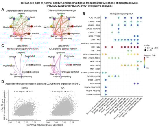 Stromal cells of patients with IUA exhibit immunosuppressive and profibrotic secretory activity. Normal—healthy donors, IUA—patients with intrauterine adhesions. The analysis was performed on scRNA-seq datasets PRJNA730360 (Normal n = 3) and PRJNA784021 (IUA n = 3), integrated, and annotated, as demonstrated in Figure 2. (A) Circle plots depict the differential number of interactions and the strength of interactions among identified cell populations between IUA and Normal groups, with orange/green edges representing increased/decreased signaling in IUA compared to the Normal group. (B) Up-regulated in IUA secreted signaling outgoing from stromal cells. (C) Circle plot showing interaction strength of Galectin signaling outgoing from stromal cells in Normal and IUA groups. (D) Associations between LGALS9 gene expression and ‘Top 100 up-regulated DEGs’ geneset enrichment scores in stromal cells in Normal and IUA groups.