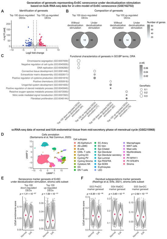 Stromal cells from patients with IUA retain the senescent phenotype and lose the ability to decid-ualize during the mid-secretory phase compared to healthy donors. Normal—healthy donors, IUA—patients with intrauterine adhesions. To differentiate between normal and senescent EnSC during decidualization, bulk RNA-seq data GSE162702 were used to estimate DEGs between se-nescent and normal EnSC exposed to decidualization stimulation in vitro. (A) Volcano plot dis-playing selected DEGs. (B) Venn diagram illustrating the intersections of identified genesets with genesets characterizing EnSC senescence in an undifferentiated state. (C) An evaluation of the bi-ological processes mediated by the analyzed genesets. To compare the endometrium from the pa-tients with IUA and normal endometrium during the mid-secretory phase, scRNA-seq datasets GSE215958 (Normal n = 6, IUA n = 9) were investigated. (D) UMAP embedding of integrated scRNA-seq data colored by cell types. (E,F) A comparison of expression identified EnSC-specific senescence genesets and decidual subpopulation marker genesets in stromal cells between Normal donors and IUA patients [].