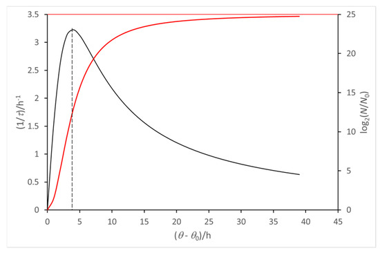 A critical issue in the model is the choice of the time origin, θ = 0, that may differ from the time origin of the relevant experiment (plate counts or optical density values), t = 0. It corresponds to log(N) = 0 (namely, N = 1), since a necessary condition to start the duplication in any given volume unit of the culture is the presence of one cell [19,20,21]. An ideal duplication process that takes place without extra constraints would display the highest specific rate. This is what occurs in real cultures when they attain so-called “balanced growth”, namely, the maximum specific growth rate. For this reason, the intercept of the straight line tangent to the growth curve of a real microbial culture at its flex point on the time axis for log(N) = 0 seemed a reasonable way to single out the time origin for the corresponding virtual culture [19,20,21]. As a basic assumption of the model, the duplication time, τ, changes with the progress of the microbial growth. The selection of the corresponding function,